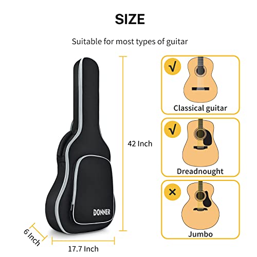 【5mm Thick Padding】Donner 40 41 inch acoustic guitar case is made of durable water-resistant 600D nylon Oxford with 5mm padded sponge, and 210D smooth soft lining fabric. Not easy to rip off and protects your guitar from collision and scratches when storing and transporting.