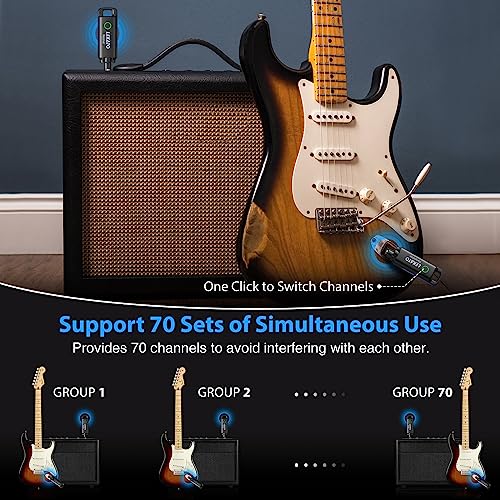 🎸70 Channels : LEKATO wireless guitar system with a updated 70 channels,can support up to 70 sets of music instrument working at the same time(Each instrument connect to corresponding speaker). One transmitter can connect to Four receivers simultaneously,a perfect transmitter receiver for live performance.