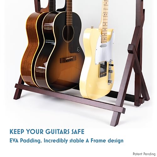 🎸 UNIQUE AND A COMPLETELY STURDY A-FRAME DESIGN – Our guitar rack for multiple guitars, offers superior stability through a new A-Frame structural design. There is no rocking or wobbling unlike other guitar stands that are held together with two screws. It is constructed with quality eco-friendly mango hardwood which is much better than cheap pine or acacia wood. The wood stand is carefully quality controlled and stained in a dark mahogany color to provide a great display stand.