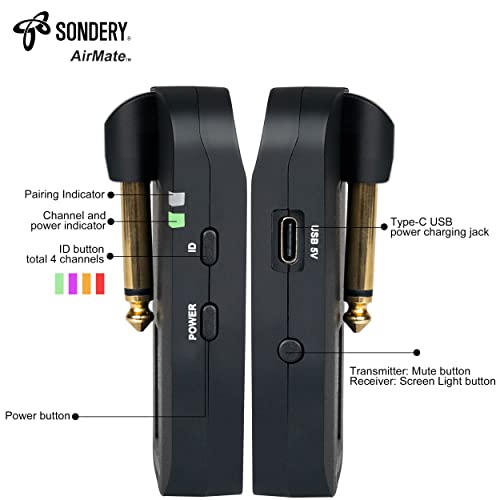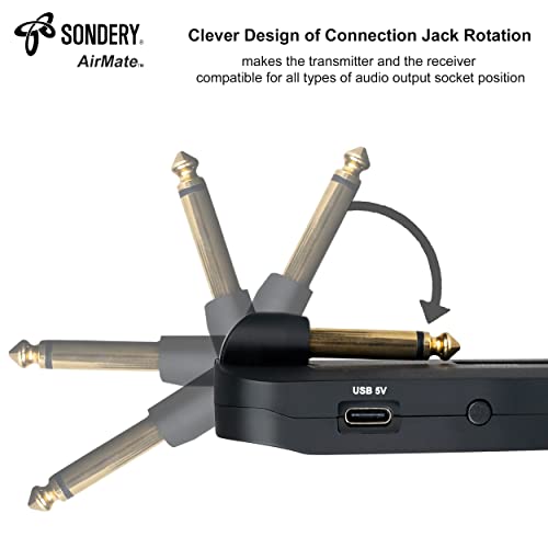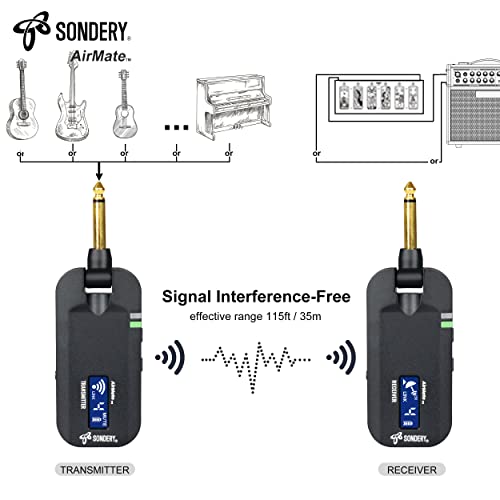 High Quality Signal. Sondery wireless system uses 24-bit 48KHz top of the range audio broadcasting. High frequency 5.8GHz is optimal for guitars with active or passive pickups, the wireless frequency is approved to be used all over the world.